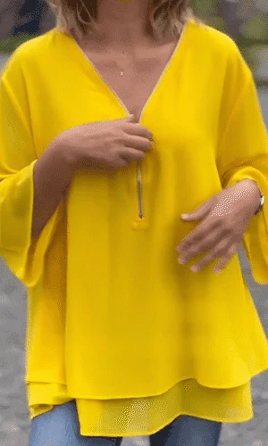 Rehaussez votre style avec notre top en mousseline de soie à fermeture éclair et col en V, doté d'un design unique à deux couches. Ce haut sophistiqué allie l'élégance aérienne de la mousseline à une touche de modernité, offrant polyvalence et confort pour toutes les occasions.