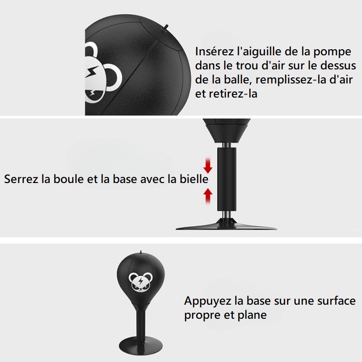 Conception pratique: Ce sac de frappe de bureau est équipé d'une ventouse, dont la puissance de succion peut atteindre 70KG, de sorte que vous pouvez facilement le connecter à diverses surfaces telles que le bois, le verre, le carrelage ou le marbre, vous offrant ainsi une expérience parfaite de relâchement de la pression.